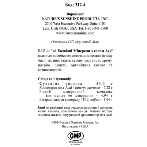 Биоактивная добавка ColloidalMineralswithAcaiJuice (Коллоидные минералы с соком Асаи) содержит набор из 74 концентрированных биоэлементов, полученных путем специальной технологии из воды находящегося в тате Юта Великого Соляного Озера (Great Salt Lake).