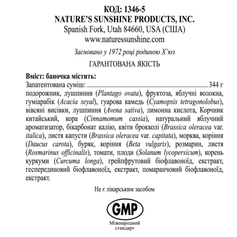 Яблочный пектин, брокколи, свекла, подорожник, куркума, морковь, капуста, овсяные отруби, розмарин, томат, биофлавоноиды, а также сафлоровое масло, смола гуара и акации, корица включены в состав комплекса