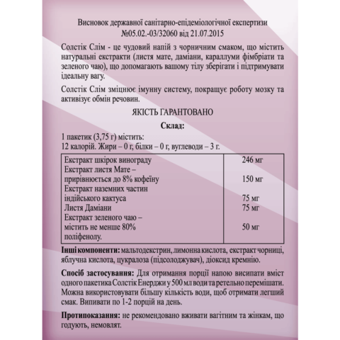 В комплексе БАД Solstic Slim (Солстик Слим) присутствует Мате — источник кофеина, который предотвращает как физическую, так и умственную усталость. Ученые института Пастера установили наличие в Мате практически всех необходимых для жизнедеятельности организма витаминов. Этот компонент содержит в себе следующие витамины: A, E, С, P, микроэлементы: Магний, Калий, Серу, Марганец, Натрий, Хлор, Медь, Железо, и др. Мате улучшает коронарное и мозговое кровообращение, улучшает работу печени, нормализирует пищеварение, благотворно влияет также на вашу иммунную систему. Этот компонент зарекомендовал себя как средство от неврозов и депрессий, лекарство от бессонницы, тревоги, сниженной активности, суетливости. Вам потребуется меньше времени на полноценный сон, который станет более глубоким. Мате снижает холестерин и жиры, предотвращает рак.